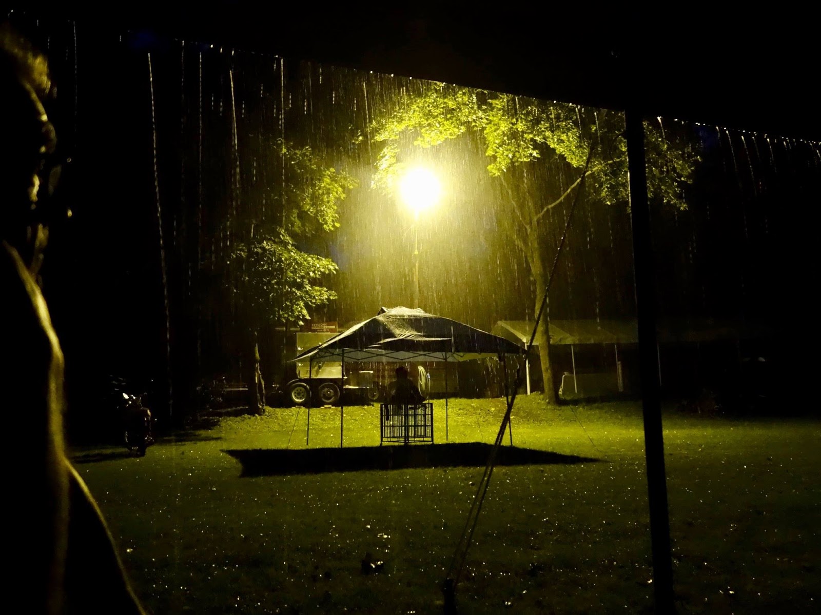 The water kept coming down till the tent area was a small river, So, we sat on tables and used the benches to keep our feet dry. It worked well.